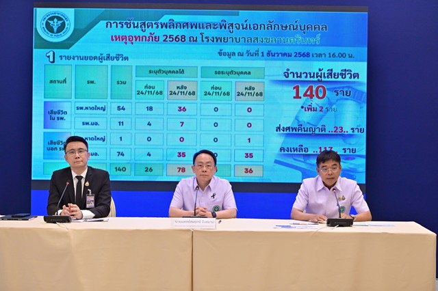 ที่ศูนย์ปฏิบัติการแก้ไขสถานการณ์ฉุกเฉินอุทกภัย (ศป.กฉ.) ทำเนียบรัฐบาล นพ.สมฤกษ์ จึงสมาน ปลัดกระทรวงสาธารณสุข พร้อมด้วย นพ.ศักดา อัลภาชน์ รองปลัดกระทรวงสาธารณสุข และ นพ.เอกชัย เพียรศรีวัชรา รองปลัดกระทรวงสาธารณสุข ร่วมแถลงข่าวในประเด็นการดำเนินงานด้านการแพทย์และสาธารณสุขในสถานการณ์อุทกภัยพื้นที่ภาคใต้ ว่า จำนวนผู้เสียชีวิตจากสถานการณ์น้ำท่วม หาดใหญ่ ณ วันที่ 1 ธันวาคม 2568 เวลา 16.00 น. มีทั้งสิ้น 140 ราย ส่วนอีก 7 จังหวัดที่เหลือได้แก่ นครศรีธรรมราช พัทลุง ตรัง สตูล ยะลา ปัตตานี และ นราธิวาส ให้ติดตามตรวจสอบและรายงานเข้ามาในระบบต่อไป