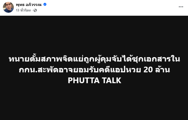 คดีเจ๊อ้อย เรื่องการทำแอปฯหวย ตั้มอาจจะยอมรับ เพราะมีคนในคดียอมรับแล้ว ตั้มเขาต้องใช้ยากล่อมประสาท ต้องกินก่อนนอน เขาเครียด ใช้ยาให้นอนหลับ ทั้งนี้ พุทธ อภิวรรณ ยังได้โพสต์ข้อความว่า ทนายตั้มสภาพจิตแย่ถูกผู้คุมจับได้ซุกเอกสารใน กกน.สะพัดอาจยอมรับคดีแอปหวย 20 ล้าน
