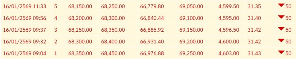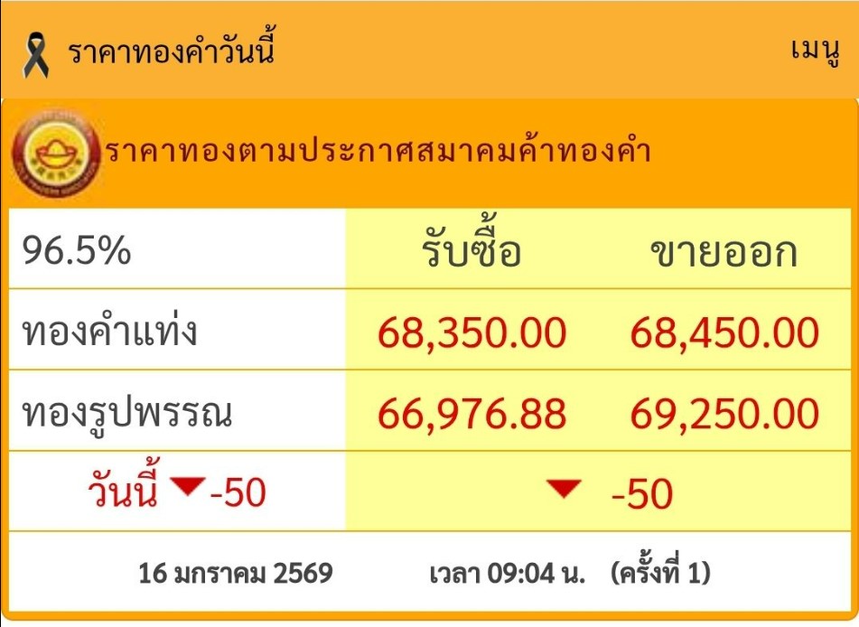 ราคาทองคำประจำวันที่ 16 ม.ค.2569 ปรับลดลง 50 บาท เปรียบเทียบกับราคาสุดท้ายของวันที่ 15 ม.ค.ที่ผ่านมา โดยทองรูปพรรณขายออกที่บาทละ 69,250 บาท ตามข้อมูลจากเว็บไซต์ของ สมาคมค้าทองคำ หรือ Gold Traders Association เมื่อเวลา 09.04 น.ที่ผ่านมา