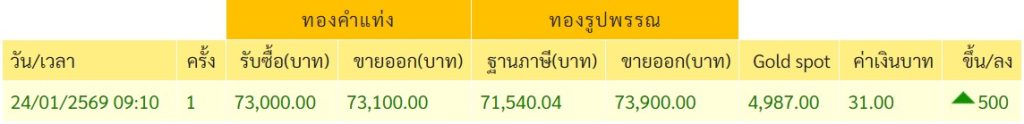 ราคาทองวันนี้ 24 มกราคม 2569 โดย สมาคมค้าทองคำ ประกาศราคาทองครั้งที่ 1 (เปิดตลาด) เมื่อเวลา 09.10 น. ปรับตัวเพิ่มขึ้นพรวดเดียว 500 บาท สู่บริเวณ 73,100 บาท