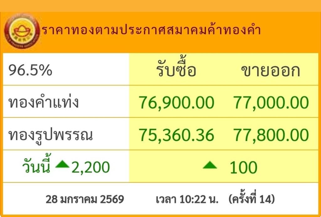 อัปเดตล่าสุด ราคาทองวันนี้ 28 มกราคม 2569 หลังเช้านี้ ประกาศครั้งที่ 1 (เปิดตลาด) เมื่อเวลา 09.04 น. ปรับตัวเพิ่มขึ้น พรวดเดียว 1,300 บาท พุ่งเลยระดับ 75,000 บาท เหนือระดับ 76,000 บาท สูงสุดเป็นประวัติการณ์ครั้งใหม่บริเวณ 76,100 บาท