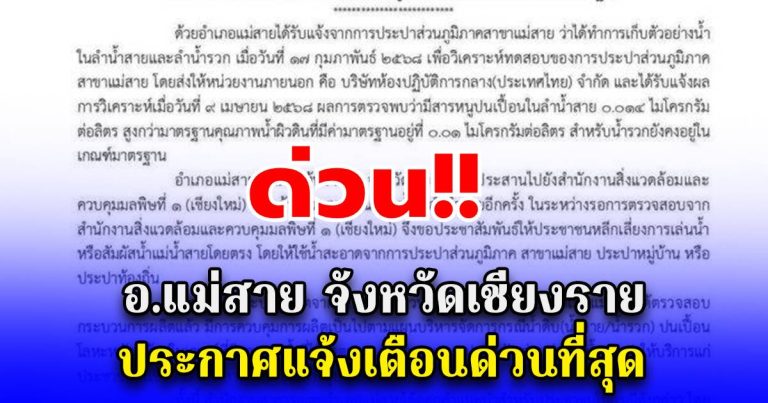 อ.แม่สาย จังหวัดเชียงราย ประกาศแจ้งเตือนด่วนที่สุด